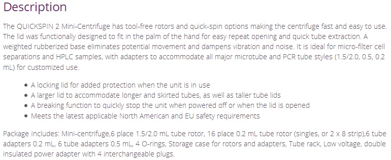 QUICKSPIN2 Mini-centrifuge,6 place 1.5/2.0 mL tube rotor, 16 place 0.2 mL tube rotor (singles, or 2 x 8 strip),6 tube adapters 0.2 mL, 6 tube adapters 0.5 mL, 4 O-rings, Storage case for rotors and adapters, Tube rack, Low voltage, double insulated power adapter with 4 interchangeable plugs.