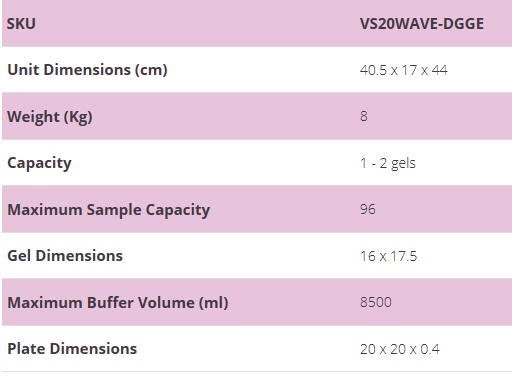 Denaturing Gradient Gel Electrophoresis Key Features Maximum 96-sample throughput compatible with microplates and thermal cycler blocks Four-screw vertical clamping technology accelerates set up Large format 20x20cm glass plates for improved resolution 100ml gradient mixer, with valve-controlled 50ml reservoir and mixing chambers, makes two 1mm parallel denaturing gradient gels Microprocessor-controlled temperature control unit accurate to 0.02C Denaturing Gradient Gel Electrophoresis (DGGE) is an important technique used in the search for mutations and DNA polymorphisms critical in genetic disorders and cancers, and to understand genetic diversity among species. The new omniPAGE VS20WAVE-DGGE is a flexible system that can be fully customised to perform several different mutation detection techniques. The VS20WAVE-DGGE is a versatile single-unit solution for different single-base pair mutation detection methods. The newly designed VS20WAVE-DGGE is a complete system for DNA mutation analysis.
