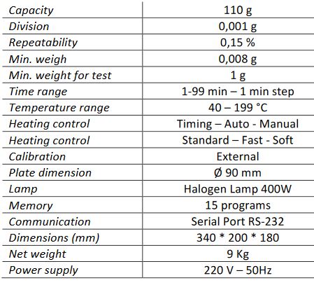 Giorgio Bormac /Italy; XS BALANCE ; Model: BM 113, digital MOISTURE balance, max. capacity 110 g, resolution 0,001 g, halogen lamp 400 W, 15 drying programs. Supplied with check weight and 50 sample plates.