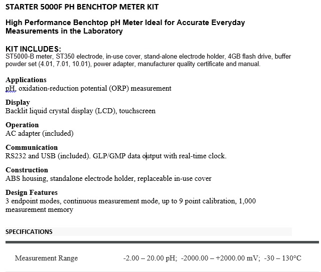 ST5000-B meter, ST350 electrode, in-use cover, stand-alone electrode holder, 4GB flash drive, buffer powder set (4.01, 7.01, 10.01), power adapter, manufacturer quality certificate and manual.