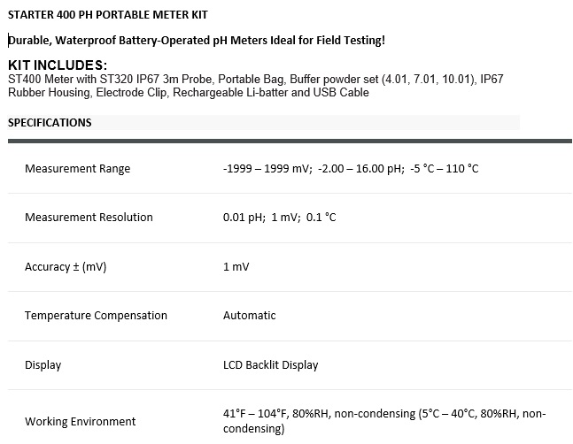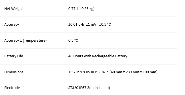ST400 Meter with ST320 IP67 3m Probe, Portable Bag, Buffer powder set (4.01, 7.01, 10.01), IP67 Rubber Housing, Electrode Clip, Rechargeable Li-batter and USB Cable