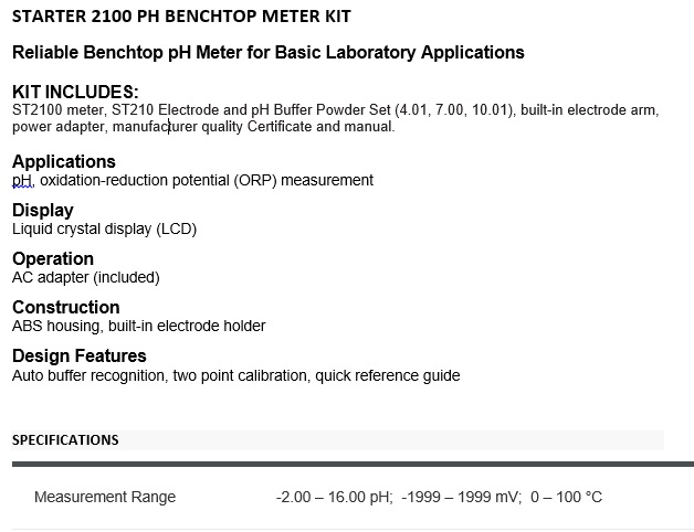 ST2100 meter, ST210 Electrode and pH Buffer Powder Set (4.01, 7.00, 10.01), built-in electrode arm, power adapter, manufacturer quality Certificate and manual.