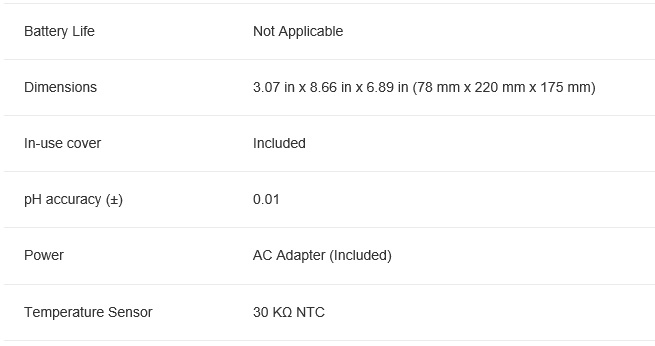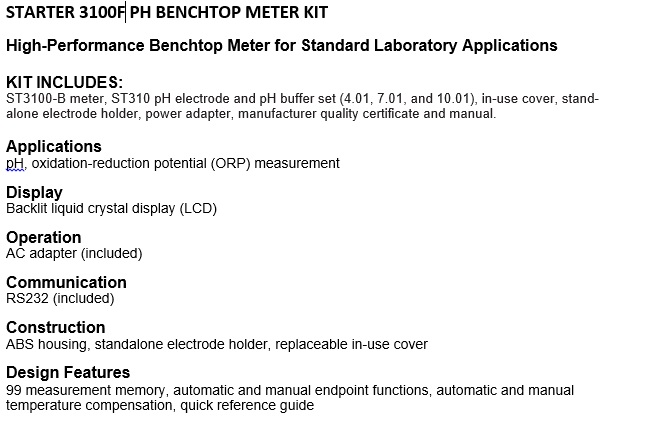 ST3100-B meter, ST310 pH electrode and pH buffer set (4.01, 7.01, and 10.01), in-use cover, stand-alone electrode holder, power adapter, manufacturer quality certificate and manual.
