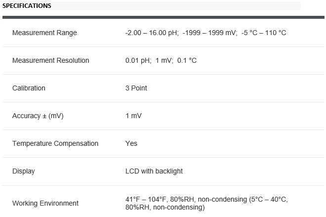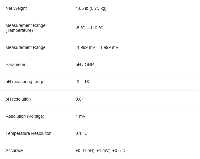 Measurement Range -2.00 – 16.00 pH;-1999 – 1999 mV;-5 °C – 110 °C