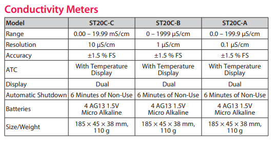 Conductivity meter ST20C-C Pen style Measurement Range 0.00 – 19.99 ms/cm;0.0 – 99.0 °C Measurement Resolution 10 μs/cm Calibration 1 Point